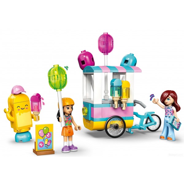 Kreatywna zabawa w sprzedawców i klientów — zachęć dzieci do wymyślania własnych historii, w których wcielają się w role klientów i sprzedawców, dzięki temu ciekawemu zestawowi LEGO Friends ze stoiskiem z jedzeniem, rowerem, balonami i lodami na patyku.
